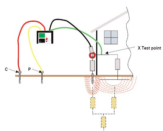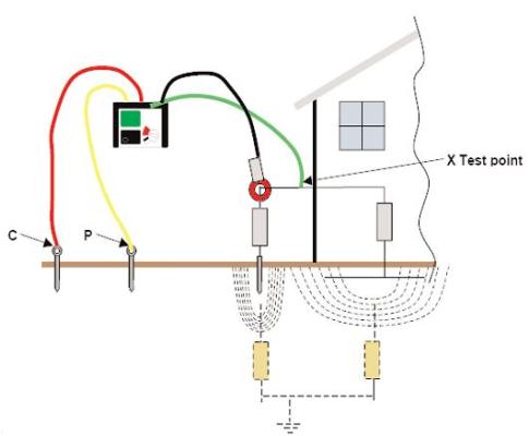 Измерение напряжение то же осуществляется на этой частоте между выводами Х и Р ( Р подключен к зондирующему потенциальному электроду) игнорируя влияние других токов протекающих по данной системе заземления.Остальное в соответствии с законом Ом для вычисления сопротивления.