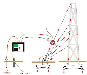 Но все оттяжки на этой опоре замкнуты вместе. Ток, измеренный клещами ICLAMP течет не только на землю через охваченный клещами проводник, но и обратно вверх по другим оттяжкам и на землю через фундаменты опоры.Это значит что измеренное сопротивление для такой схемы подключения будет неправильным.