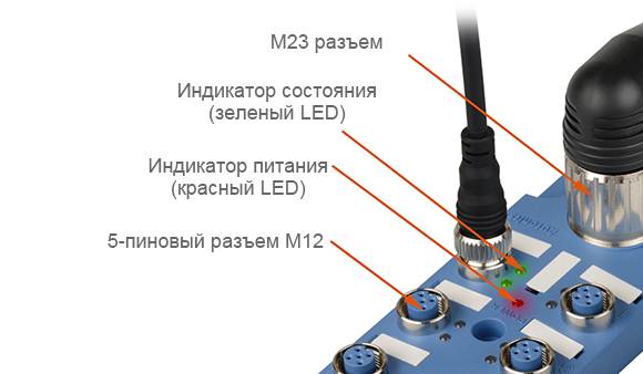 Общий вид и назначение индикаторов распределительных коробок серии PT компании Autonics с 4-контактными разъемами M12 и кабельным выходом показаны на рис. 2.