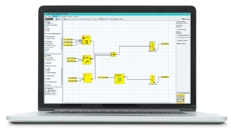 Конфигурирование многофункциональной системы безопасности осуществляется с помощью удобного программного обеспечения PSRmodular, которое содержит в себе все необходимые функции безопасности с возможностью диагностики. После создания графической схемы безопасности конфигурация может быть загружена в систему напрямую через USB-интерфейс. В качестве альтернативы возможно использование предварительно сконфигурированного модуля памяти для быстрой наладки установок без использования ноутбука. Другой важной особенностью ПО PSRmodular является поддержка функции отчетов с расчетом индивидуального времени срабатывания функций безопасности (Рис. 4).