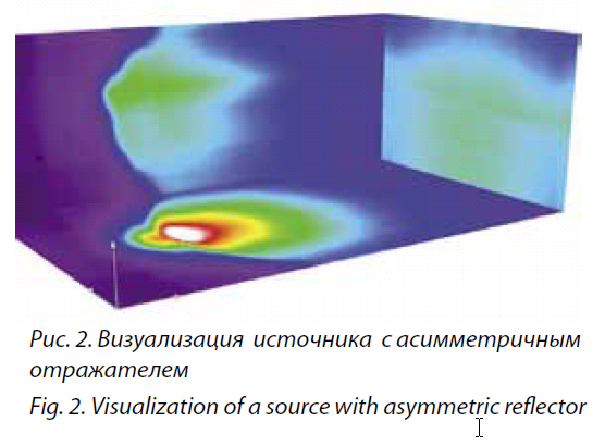 В каждом из них применены одинаковые источники света, что создает достаточную освещенность как при рассмотрении удаленных, так и близко расположенных объектов. Наличие источника света с широкой диаграммой распределения светового потока позволяет полностью устранить эффект «рысканья» светового пятна по небольшим объектам. Визуализация распределения световых потоков от каждого источника света приведена на рис. 1, 2 для помещения 6×10 м и расположении головного светильника на высоте 1, 8 м.