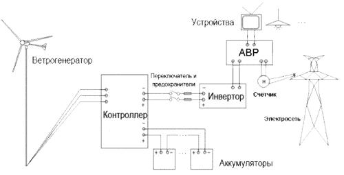 Ветрогенератор (с аккумуляторами) и коммутация с сетью.